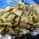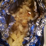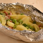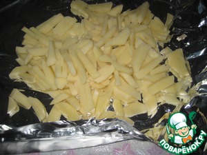 Итак, расстилаем в три-пять слоев фольгу. Очищаем свежий картофель -