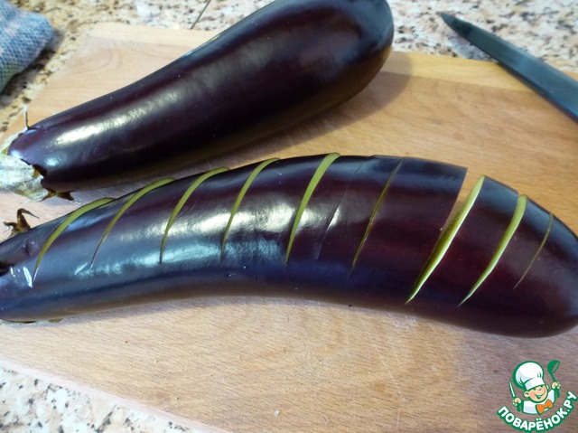 Баклажаны надрезать поперек, не прорезая донизу