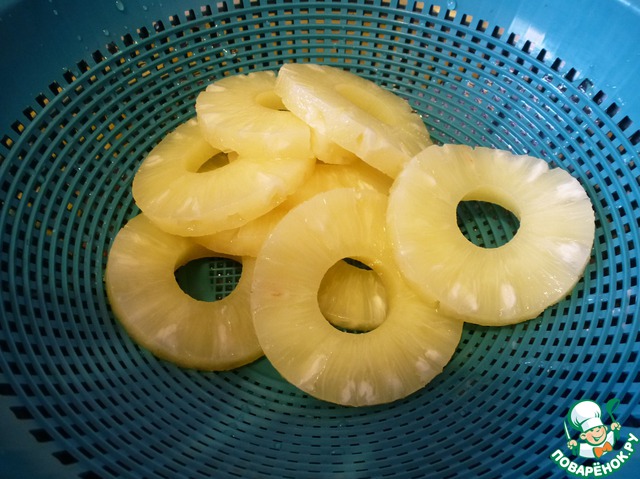 • Консервированные ананасы откинуть на дуршлаг, жидкость из-под ананасов собрать, она понадобится нам для маринада.