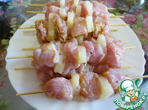 • На шпажки нанизываем мясо, чередуя с кусочком ананаса