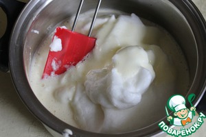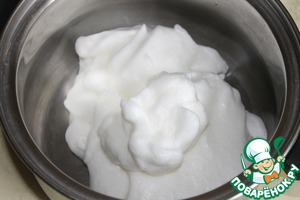 4 белка взбиваем сначала на небольшой скорости, постепенно увеличивая скорость, через пару минут добавляем 25г сахара, продолжаем взбивать до устойчивой пены