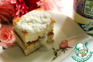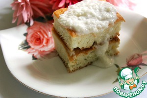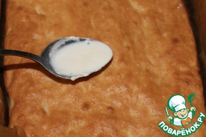И залить кокосовой заливкой. Разрезать пополам, положить одну половинку на другую и дать постоять и пропитаться несколько часов. Хочу вам сказать, что наутро, постояв ночь, пирог был просто восхитительным. Но осталось его немного)))