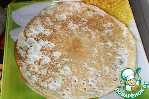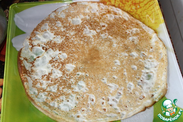 Напекла тоненьких блинчиков. Благодаря крахмалу, блинчики очень хорошо переворачиваются и держат форму. И структура у них получается очень воздушная и легкая