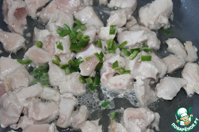 Филе мелко нарезать, обжарить чуть на кунжутном масле, добавить зеленый, мелко нарезанный перчик чили