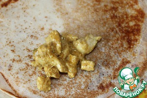 Приступаем к фаршированию. Ну тут я ничего не придумала нового. Все как обычно. Начинку на краешек блинчика, и заворачиваем конвертиком