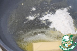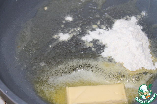 Можно на этом и остановиться и обжарить блинчики на сливочном масле, но я решила приготовить заливку, так, чтобы не просили мои родные соус, с чем кушать эти блинчики. Обычно у нас налистники со сметаной или со сгущенкой, а этот вариант я не знала, с чем подать, так что, идем дальше. Сливочное масло топим на сковороде, добавляем 1 ст. л. муки и обжариваем до золотистого цвета