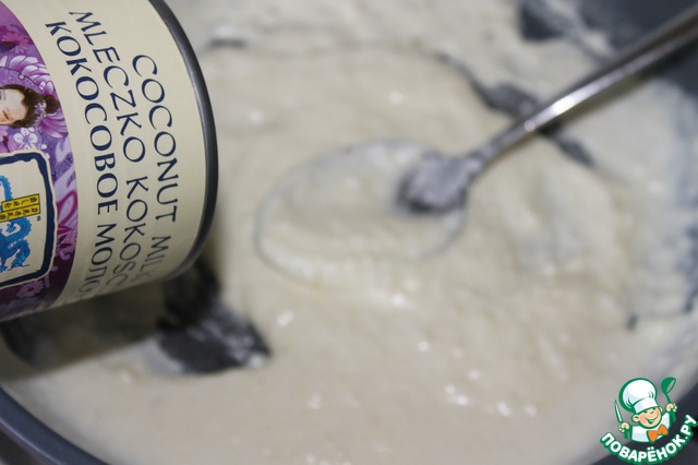 Но в этот раз мне захотелось совсем уж экзотики и часть коровьего молока я заменила на кокосовое молоко. Тесто получилось погуще и я плеснула 50г кипятка -