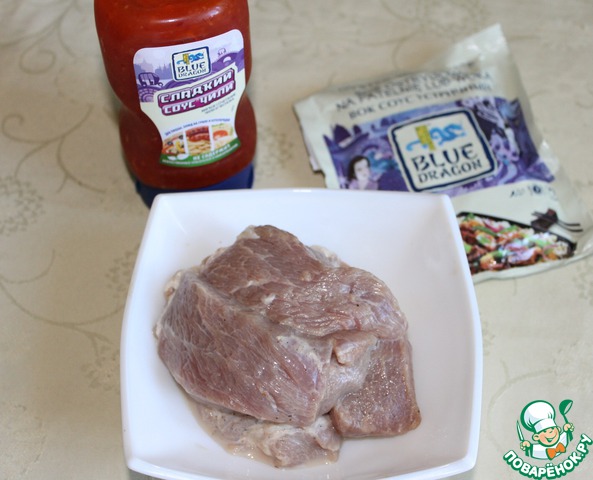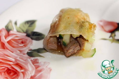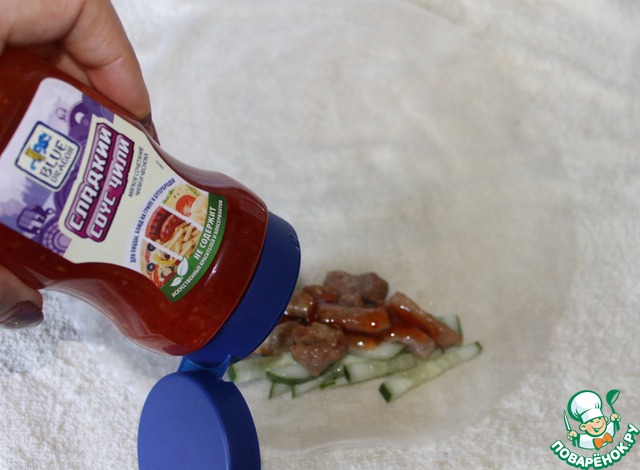 • На одну сторону рисового блинчика выложить тонко нарезанный огурчик, немного обжаренной свинины и полить соусом сладкий чили от Blue Dragon. И завернуть конвертиком