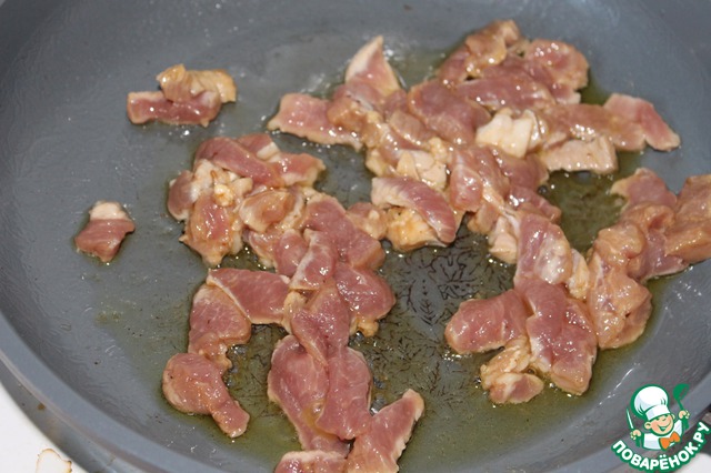 • Замаринованное мясо мелко нарезать, обжарить на кунжутном масле