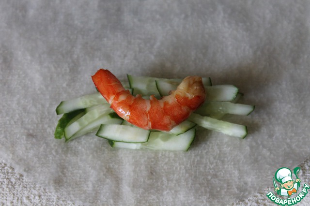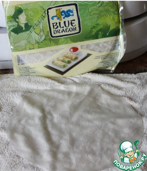 • Лист рисовой бумаги опустить на 15 сек. в горячую воду, вынуть и разложить на полотенце.