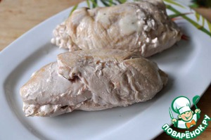 Куриную грудку (без кости) моем, обсушиваем полотенцем, разрезаем вдоль по толщине, но не до конца, отбиваем.