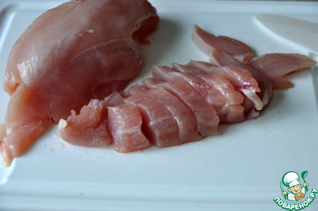 Куриную грудку (филе) моем, обсушиваем полотенцем, нарезаем тонкими полосками.