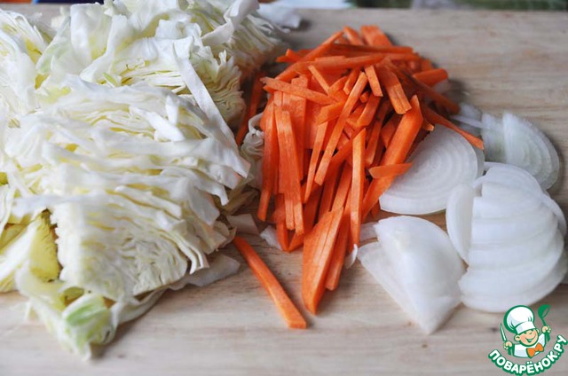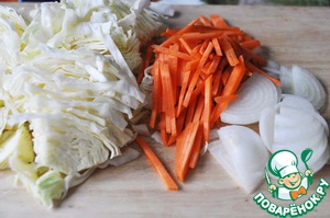 Нарезаем молодую капусту полосками, морковь натираем, как по-корейски, лук нарезаем полукольцами.