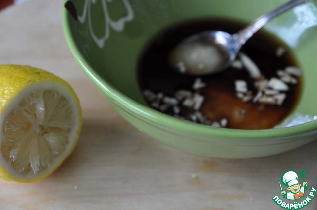 Смешиваем сок лимона, воду, соевый соус, мёд, крахмал и мелко нарезанный чеснок. -