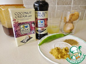 • В мисочке хорошенько смешиваем арахисовое масло, сок лимона, кокосовые сливки, мед, карри, соевый соус, тмин и мелко нарезанный жгучий перец.