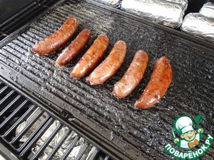 Достаем колбаски из маринада. Маринад не выбрасываем! Обжариваем колбаски на барбекю.