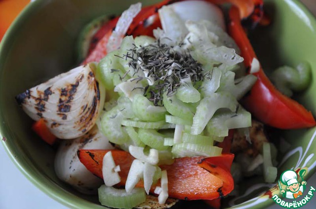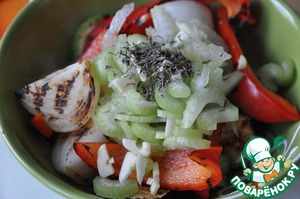 Мелко нарезаем черешковый сельдерей и чеснок, добавляем их в ещё горячие овощи, чтобы пропитались ароматом.