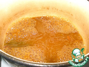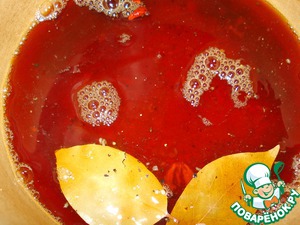 В кастрюле смешаем соевый соус, воду, рисовый уксус, раздавленный чеснок, добавим перец, лавровый лист.