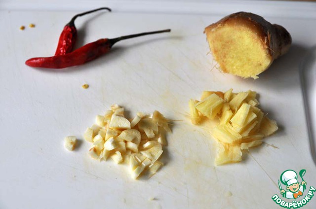 Мелко нарезать чеснок, имбирь, приготовить заранее перец чили.