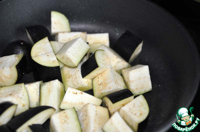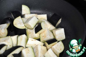 Баклажаны обжарить до золотистого цвета на раскалённом масле в воке в течении 4 минут.