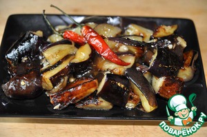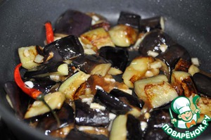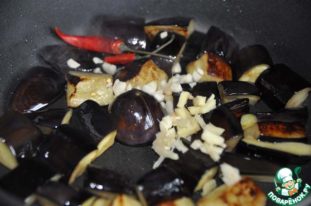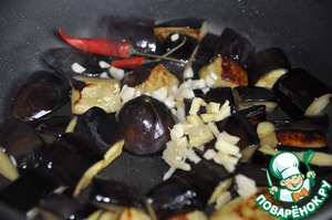 Добавить к баклажанам перец-чили, мелко нарезанный чеснок и имбирь, перемешать.