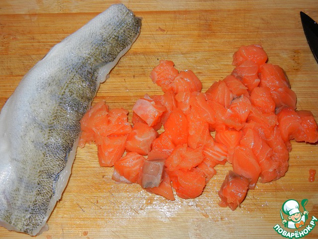 Филе судака и семги нарезаем на небольшие кусочки и обжариваем на растительном масле, слегка присолив.