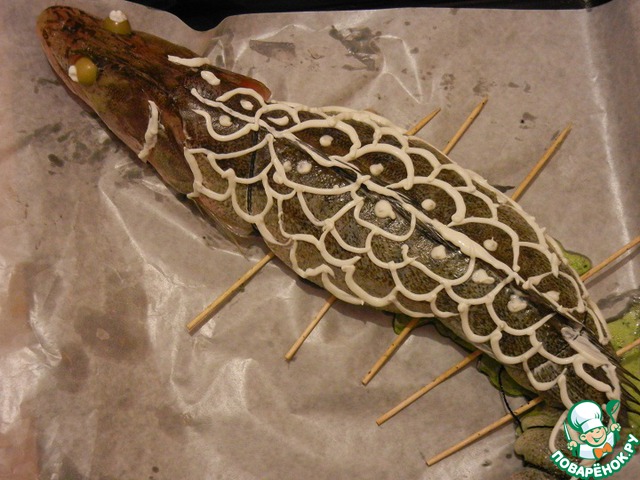 Судачка полить лимонным соком и выложить на него нашу начинку. Скрепляем животик деревянными шампурами (можно просто перевязать кулинарной нитью) и выложить на противень, застеленный пергаментом. Можно украсить.. вместо глазок у меня оливки, а на спинке "чешуя" из сметаны. Рыбку сбрызнуть оливковым маслом и запекать в хорошо разогретой до 180 градусов духовке около 15-20 минут.