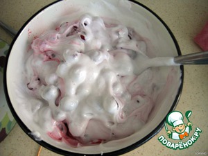 4. взбить белки в крепкую пену. смешать половину белков с очищенными от косточек вишнями