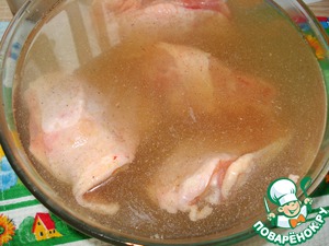 В рассол добавить курицу и оставить в прохладном месте минимум на 2 часа, можно на сутки.