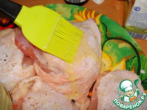 Гриль разогреем. Кусочки курицы посолим, поперчим и смажем глазурью.