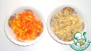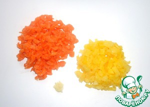 За это время приготовим начинки. Филе форели и консервированные ананасы мелко нарезаем, чеснок пропускаем через пресс для первой начинки.