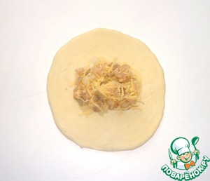 Затем кусочки теста раскатываю в тонкие лепешки, так как мы не любим, когда в пирожке много теста, и выкладываю начинки - первую.