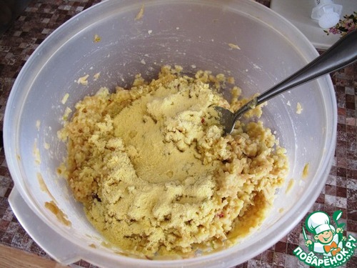 Затем долейте молоком и варите до загустения, помешивая. Нам нужна густая каша. Снимите с огня и охладите.
