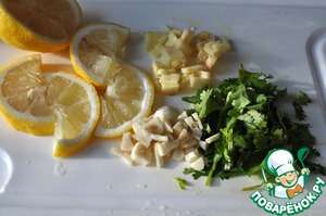 Нарезаем полукольцами лимон, мелко нарезаем кинзу, имбирь и чеснок.