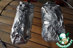 Завернуть фольгу конвертиком и запечь 20 минут на углях или решётке барбекюшницы.