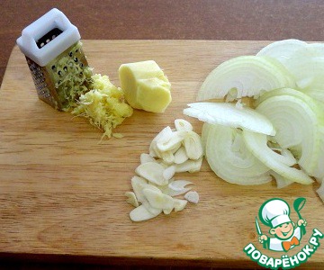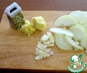 Лук нарезать полукольцами, чеснок лепестками, корень имбиря почистить, натрем на средней терке.