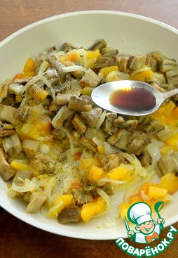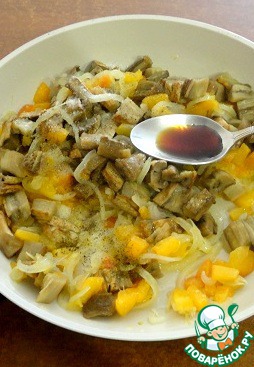 На растительном масле пожарить лук, чеснок, имбирь, добавить абрикосы и уксус бальзамический. Всё вместе тушить 5 минут.