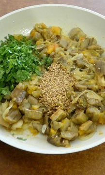 Добавить баклажаны и тушить ещё 5-7 минут, в конце добавить мелко нарезанную кинзу и кунжут (я слегка обжарила его на сухой сковороде)