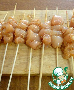 Нанизать полоски курицы «волнами» на деревянные шпажки, посыпать кунжутными семенами.