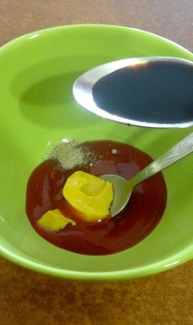 Смешать кетчуп, горчицу, соевый соус.