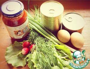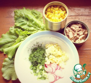 • Пока займемся начинкой. Припасенные консервы (кукурузу и тунец) достанем из кладовки, яйца отварим вкрутую, зелень промоем в холодной воде и обсушим.