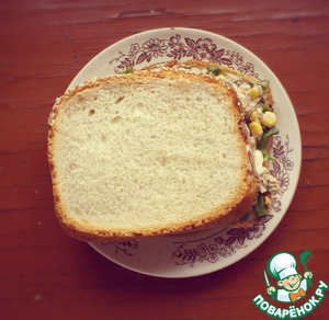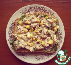 • Укроп и лук измельчим, редисочку нашинкуем прозрачными кружочками, яйцо разомнем вилкой. С тунца и кукурузы сольем ненужный сок. Добавим по столовой ложке майонеза и кисло-сладкого соуса (в классическом сэндвиче с тунцом, как правило, смешивается майонез с горчицей, мы заменим горчицу на кисло-сладкий соус, он прекрасно подойдет к рыбе и придаст пикантности). Все смешаем в однородную массу. Можно кушать так, как салатик, можно оставить на бутерброды.