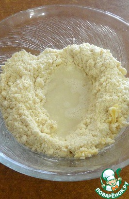 Просеять кукурузную и пшеничную муку в миску. Добавить разрыхлитель, фету и растопленное масло, перемешать руками, чтобы смесь напоминала крошки.