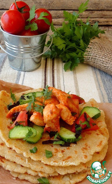Рецепт «Кукурузно-сырные лепешки с куриным филе и овощами»: