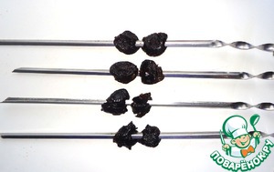 • Затем на не очень длинные шампуры или деревянные шпажки нанизываем по 2 - 3 шт. чернослива.