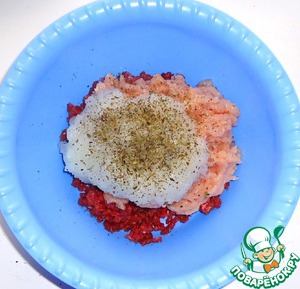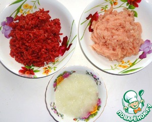 • Начинаем готовить нетрадиционные "люля - кебаб" с подготовки ингредиентов. Куриное филе и мякоть говядины пропускаем через мясорубку 2 раза по отдельности, затем пропускаем через мясорубку лук, сливаем с лука сок.