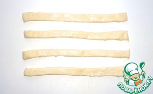 • Готовое бездрожжевое (хотя можно взять и дрожжевое на ваш вкус) слоёное тесто размораживаем и режем на полоски ~ 2 см.