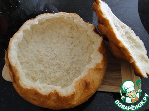 Срезаем верхушку у булки хлеба, оставляя высокий бортик. Вынимаем мякиш. Его можно подсушить и сохранить для панировки, а можно на природе покормить птиц.