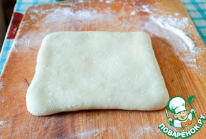 Переворачиваем тесто швом вниз и снова раскатываем в квадратик.