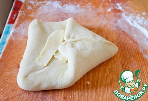 Сворачиваем тесто конвертиком, загибая все углы вовнутрь.